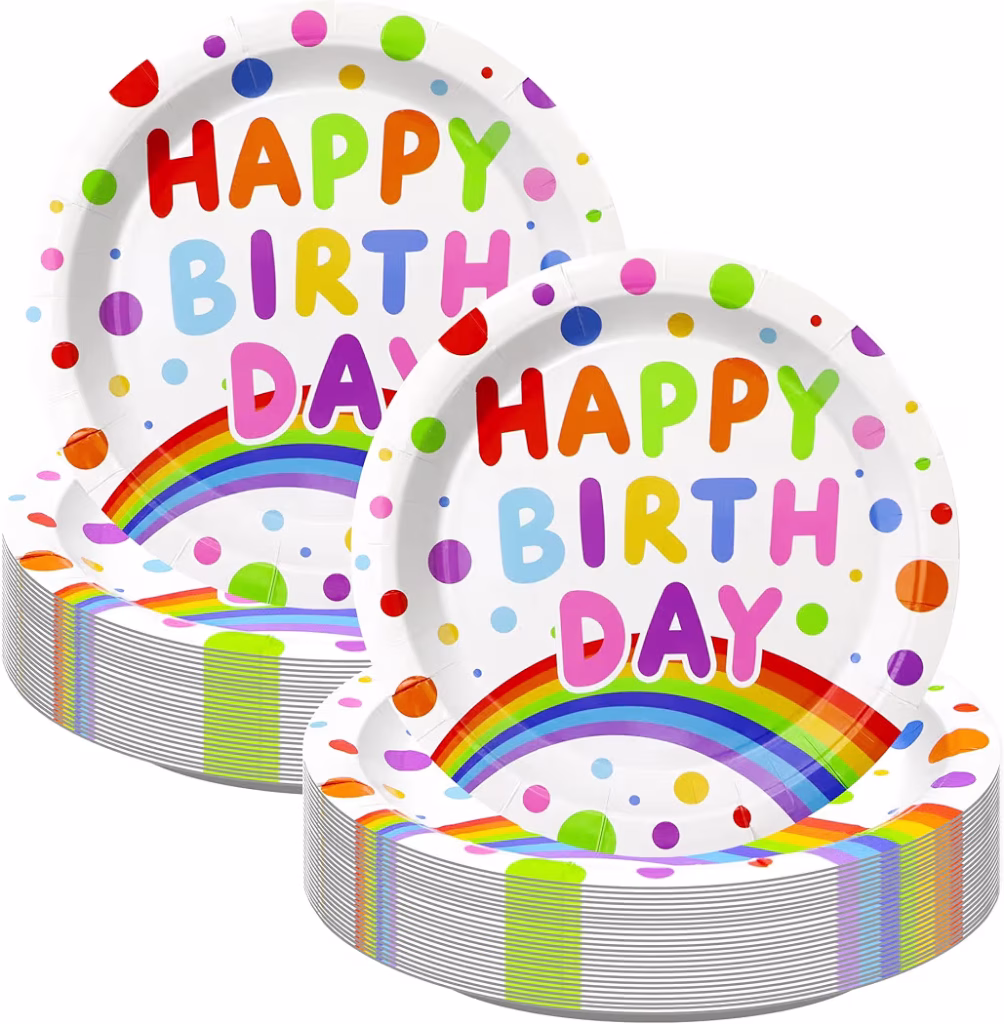 50pcs Birthday Paper Plates 9 Inch Disposable Happy Birthday Dots Rainbow Design Tableware Party Supplies for 50 Guests